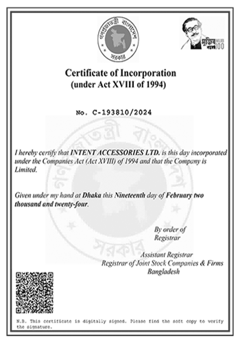 With a strong focus on quality, consistency, and customer satisfaction, Intent Accessories Ltd combines modern technology, skilled craftsmanship, and efficient management practices to deliver exceptional products that meet global standards. The company’s mission is to support garment manufacturers with complete accessory solutions that enhance both product presentation and brand value.